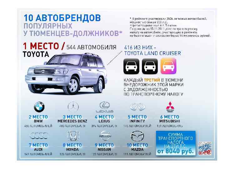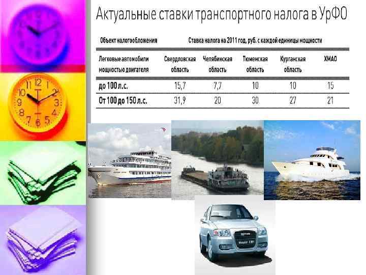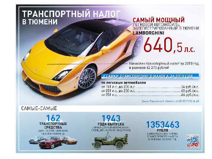 Ставки транспортного налога на легковые автомобили и мотоциклы в Тюменской области за 2010 и 2011 годы для организаций: Объект налогообложения Автомобили легковые с мощностью двигателя (с каждой лошадиной силы): 2011 г. (руб. за 1 л. с. ) до 100 л. с. (до 73, 55 к. Вт) включительно: 10 свыше 100 л. с. до 150 л. с. (свыше 73, 55 к. Вт до 110, 33 к. Вт) включительно 30 свыше 150 л. с. до 200 л. с. (свыше 110, 33 к. Вт до 147, 1 к. Вт) включительно 34 свыше 200 л. с. до 250 л. с. (свыше 147, 1 к. Вт до 183, 9 к. Вт) включительно 40 свыше 250 л. с. (свыше 183, 9 к. Вт) 66 Мотоциклы и мотороллеры с мощностью двигателя (с каждой лошадиной силы) до 20 л. с (до 14, 7 к. Вт) включительно 4 свыше 20 л. с. до 35 л. с. (свыше 14, 7 к. Вт до 25, 74 к. Вт) включительно 8 свыше 35 л. с. (свыше 25, 74 к. Вт) 20