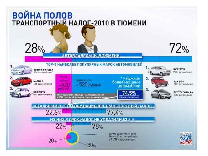 Тюменская область Срок уплаты транспортного налога физическими лицами за 2011 год – не позднее 15 ноября 2012 года. Ставки транспортного налога на легковые автомобили и мотоциклы в Тюменской области за 2011 года для физических лиц: Объект налогообложения Автомобили легковые с мощностью двигателя (с каждой лошадиной силы): 2011 г. (руб. за 1 л. с. ) до 100 л. с. (до 73, 55 к. Вт) включительно: свыше 100 л. с. до 150 л. с. (свыше 73, 55 к. Вт до 110, 33 к. Вт) включительно свыше 150 л. с. до 200 л. с. (свыше 110, 33 к. Вт до 147, 1 к. Вт) включительно 0 0 автомобили отечественного производства и производства стран СНГ, с даты выпуска которых прошло более 10 лет (только для одного автомобиля) импортные автомобили, с даты выпуска которых прошло 10 лет и менее, второй автомобиль свыше 200 л. с. до 250 л. с. (свыше 147, 1 к. Вт до 183, 9 к. Вт) включительно 25, 5 34 автомобили отечественного производства и производства стран СНГ, с даты выпуска которых прошло более 10 лет (только для одного автомобиля) импортные автомобили, с даты выпуска которых прошло 10 лет и менее, второй автомобиль свыше 250 л. с. (свыше 183, 9 к. Вт) автомобили отечественного производства и производства стран СНГ, с даты выпуска которых прошло более 10 лет (только для одного автомобиля) импортные автомобили, с даты выпуска которых прошло 10 лет и менее, второй автомобиль 30 40 49, 5 66 Мотоциклы и мотороллеры с мощностью двигателя (с каждой лошадиной силы) до 20 л. с (до 14, 7 к. Вт) включительно свыше 20 л. с. до 35 л. с. (свыше 14, 7 к. Вт до 25, 74 к. Вт) включительно отечественного производства и производства стран СНГ импортные свыше 35 л. с. (свыше 25, 74 к. Вт) отечественного производства и производства стран СНГ импортные 0 4 0 8 0 20