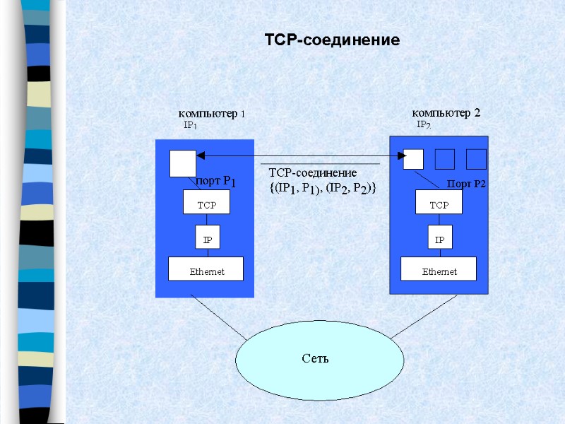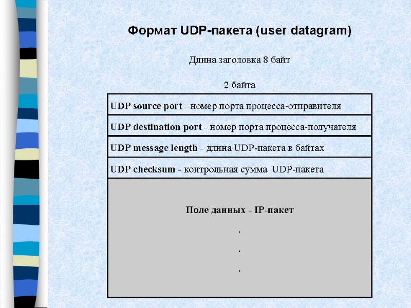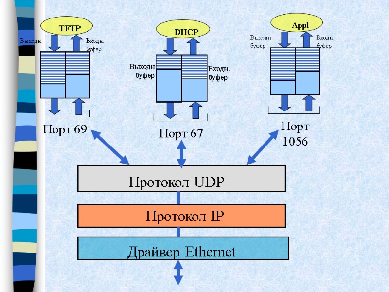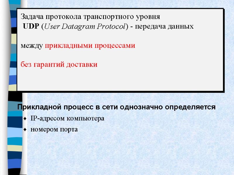 Порт UDP идентификатор приложения определяет обменный буфер, создаваемый ОС в оперативной памяти если буфер переполняется, то сообщения отбрасываются Основная функция протокола UDP – мультиплексирование и демультиплексирование процессов на основе портов