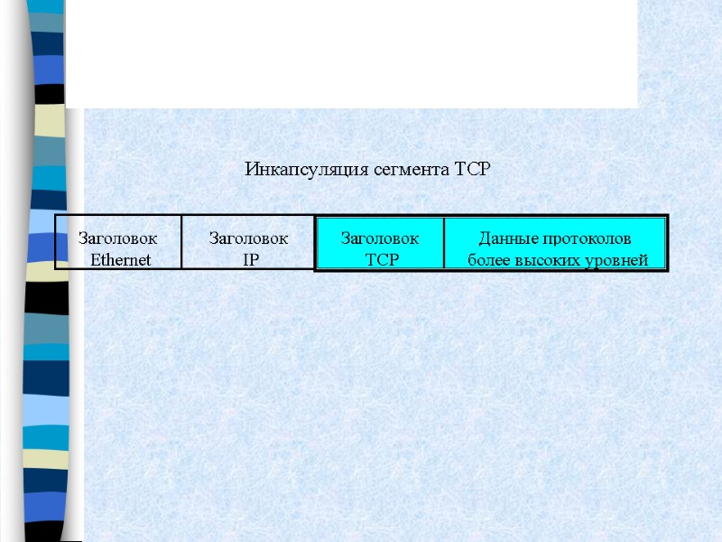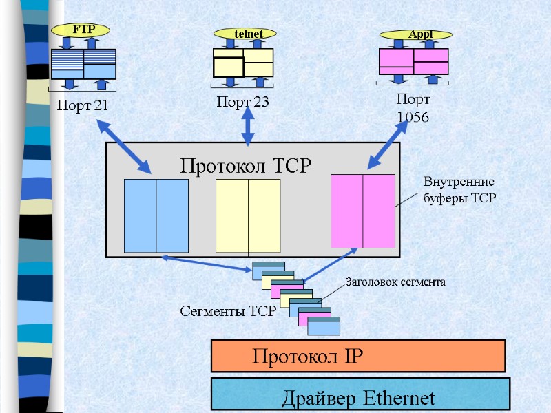 FTP telnet Порт 23 Протокол TCP Appl Протокол IP Внутренние буферы TCP Сегменты TCP Заголовок сегмента