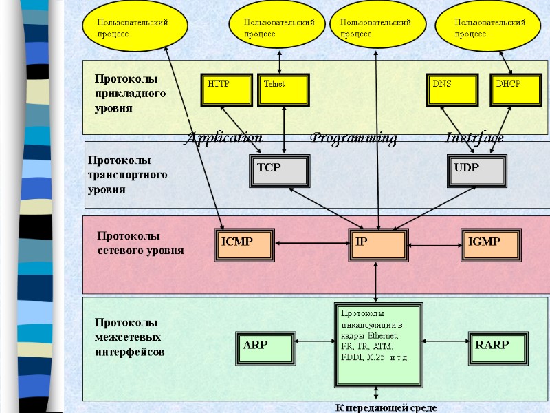К передающей среде Протоколы межсетевых интерфейсов RARP Протоколы инкапсуляции в кадры Ethernet, FR, TR, ATM, FDDI, X.25 и т.д. ARP TCP UDP Протоколы транспортного уровня IGMP IP ICMP HTTP Протоколы прикладного уровня Telnet DHCP DNS Пользовательский процесс Пользовательский процесс Пользовательский процесс Пользовательский процесс Протоколы сетевого уровня Application Programming Inetrface
