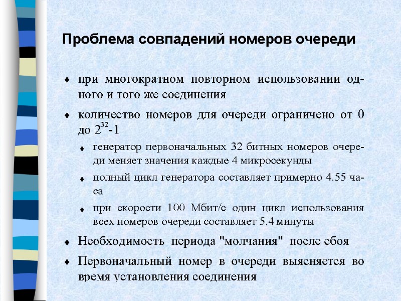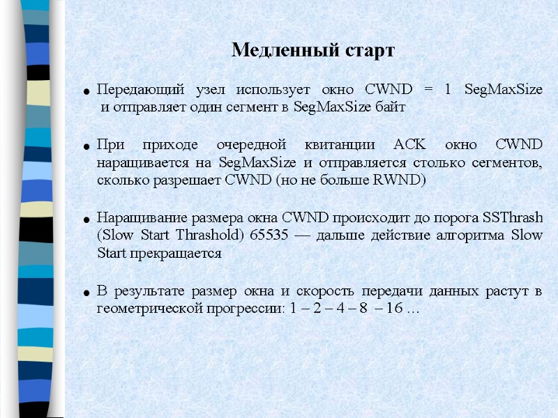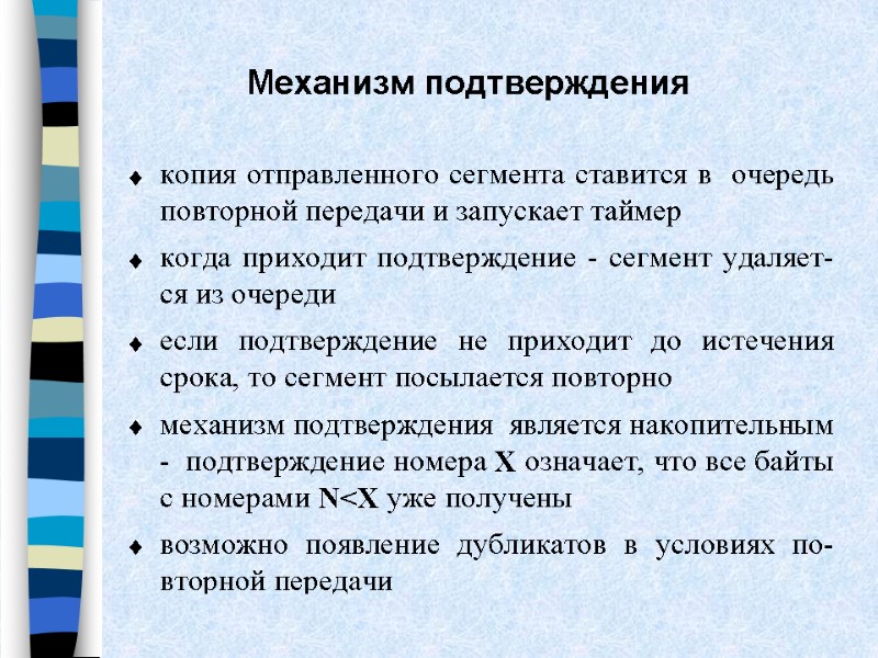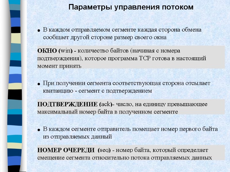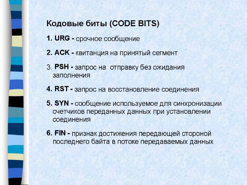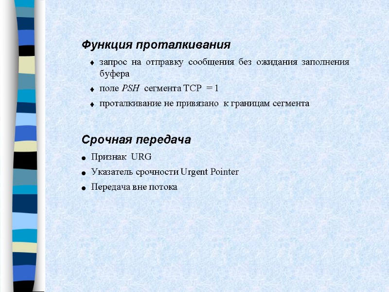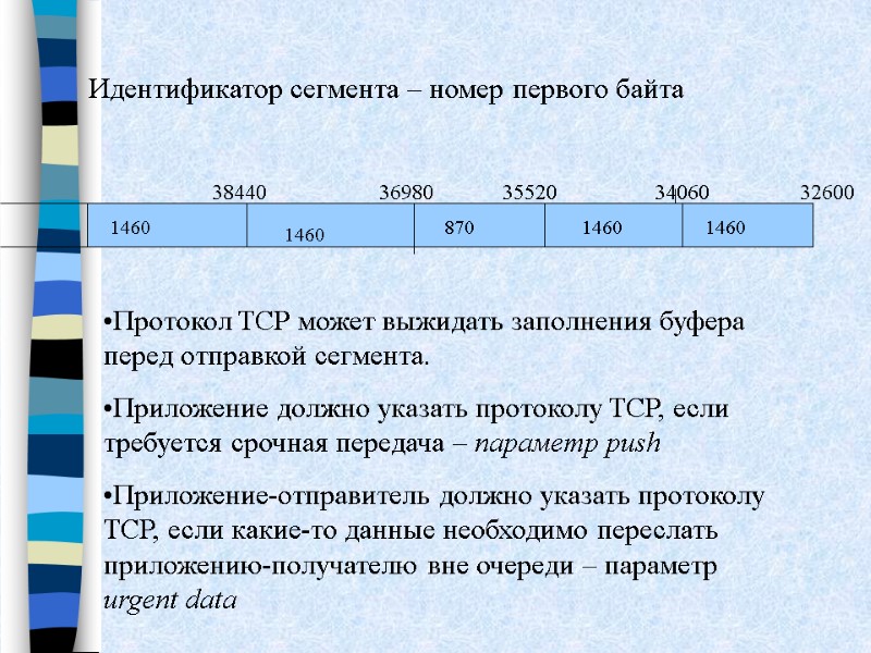 Идентификатор сегмента – номер первого байта 32600 Протокол TCP может выжидать заполнения буфера перед отправкой сегмента. Приложение должно указать протоколу TCP, если требуется срочная передача – параметр push Приложение-отправитель должно указать протоколу TCP, если какие-то данные необходимо переслать приложению-получателю вне очереди – параметр urgent data