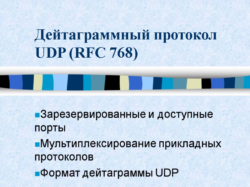 Дейтаграммный протокол UDP (RFC 768) Зарезервированные и доступные порты Мультиплексирование прикладных протоколов Формат дейтаграммы UDP