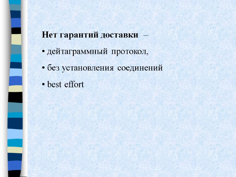Нет гарантий доставки – дейтаграммный протокол, без установления соединений best effort
