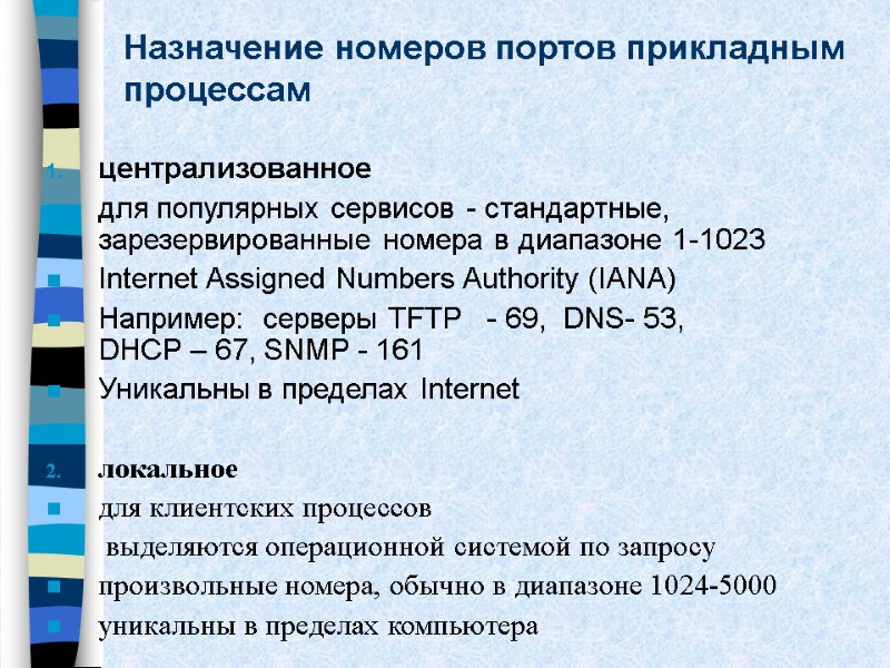 Назначение номеров портов прикладным процессам централизованное для популярных сервисов - стандартные, зарезервированные номера в диапазоне 1-1023 Internet Assigned Numbers Authority (IANA) Например: серверы TFTP - 69, DNS- 53, DHCP – 67, SNMP - 161 Уникальны в пределах Internet локальное для клиентских процессов выделяются операционной системой по запросу произвольные номера, обычно в диапазоне 1024-5000 уникальны в пределах компьютера