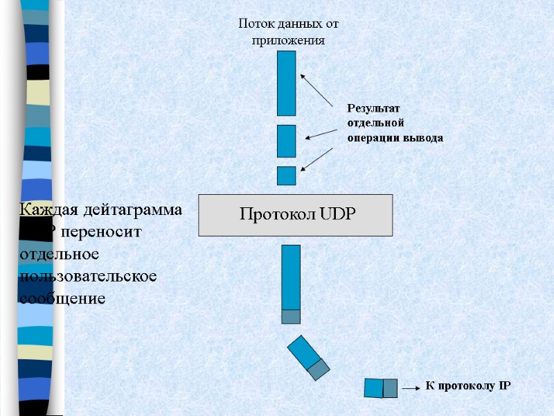 Протокол UDP Поток данных от приложения Результат отдельной операции вывода К протоколу IP Каждая дейтаграмма UDP переносит отдельное пользовательское сообщение