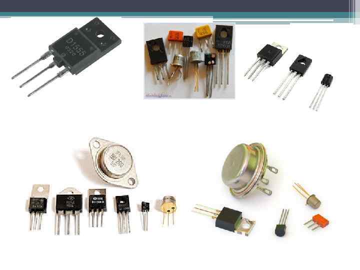 Классификация транзисторов • По структуре 1. 2. Биполярный транзистор Полевой транзистор • По основному полупроводниковому материалу 1. 2. 3. Германиевые Кремниевые Арсенид-галлиевые • По мощности 1. 2. 3. Маломощные транзисторы до 100 м. Вт Транзисторы средней мощности от 0, 1 до 1 Вт Мощные транзисторы (больше 1 Вт)