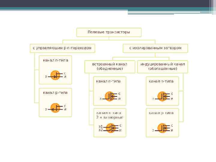Классификация полевых транзисторов • Транзисторы с управляющим p-n-переходом • Транзисторы с изолированным затвором (МДПтранзисторы) ▫ МДП-транзисторы с индуцированным каналом ▫ МДП-транзисторы со встроенным каналом ▫ МДП-структуры специального назначения