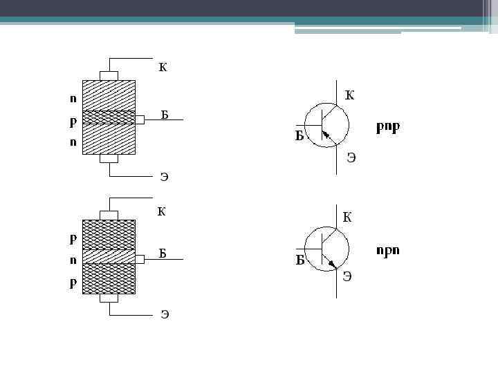 Устройство • Электроды подключены к трём последовательно расположенным слоям полупроводника с чередующимся типом примесной проводимости. По этому способу чередования различают n-p-n и p-n -p транзисторы • Биполярный транзистор состоит из трёх различным образом легированных полупроводниковых слоёв: эмиттера E (Э), базы B(Б) и коллектора C (К). В зависимости от чередования типа проводимости этих слоёв различают n-p-n (эмиттер − nполупроводник, база − p-полупроводник, коллектор − nполупроводник) и p-n-p транзисторы. К каждому из слоёв подключены проводящие невыпрямляющие контакты.