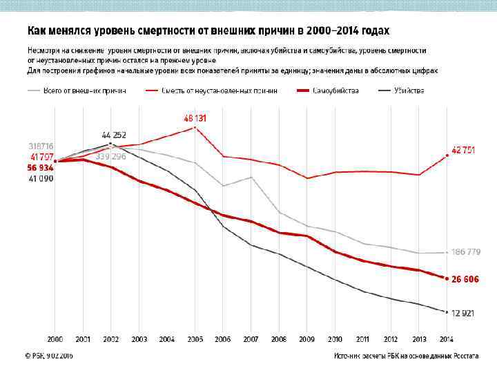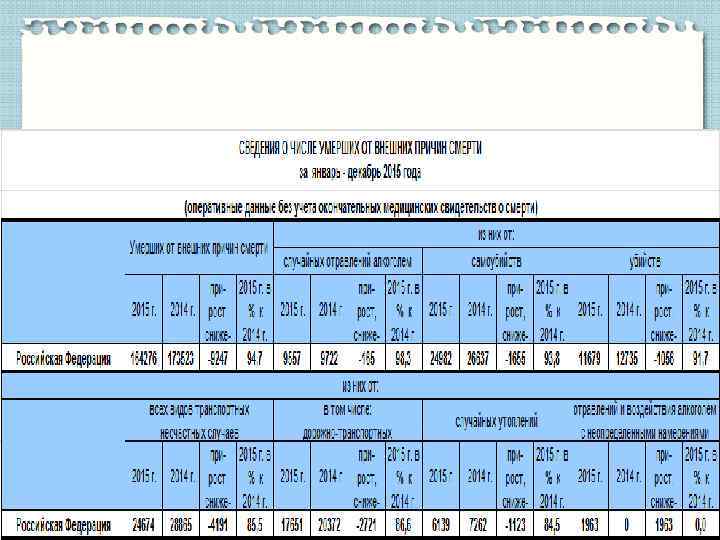 Травматизм в Российской Федерации Снижение смертности, по сравнению с аналогичными данными за 2014 год, продолжалось по всем основным группам внешних причин смерти. Снижение смертности от самоубийств, убийств и случайных отравлений алкоголем стало устойчивой тенденцией в последние годы. Смертность от всех видов транспортных несчастных случаев также снижается, но в 2009 2014 годах преобладала, скорее, стабилизация значения показателя.