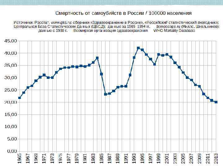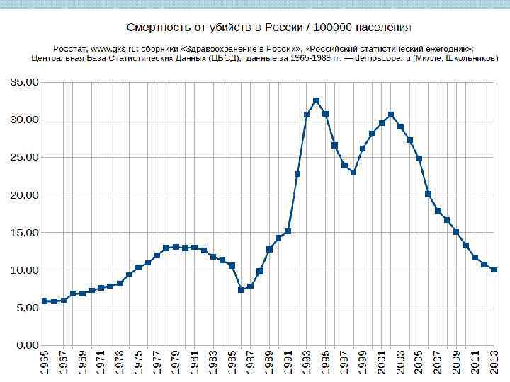 Травматизм в Российской Федерации В 2015 году в результате транспортных несчастных случаев погибли 24, 7 тыс. чел. (в 2014 г. – 28, 9 тыс. чел. , а в отдельные годы потери превышали 40 тыс. чел. , например, в 1990 г. – 43, 2), в т. ч. в результате ДТП – 17, 6 тыс. чел. (20, 4). В результате самоубийств ушли из жизни почти 25 тысяч человек (в 2014 году – 26, 6 тысячи человек, в 1994 году – 61, 9 тысячи человек). Убийства унесли жизни 11, 8 тысячи человек (12, 7; в 1994 году – 47, 9 тысячи человек). От случайных отравлений алкоголем в 2015 году умерли 9, 6 тысячи человек (9, 7 тысячи человек в 2014 году, в 1994 году – 55, 5 тысячи человек), случайные утопления стали причиной смерти 6, 1 тысячи человек (7, 3), прочие внешние причины – 85, 3 тысячи человек (88, 3 тысячи человек).