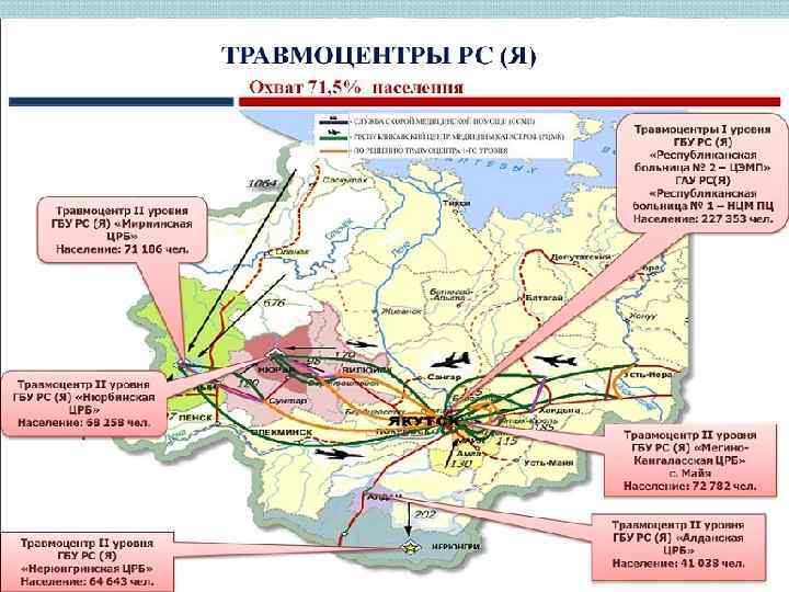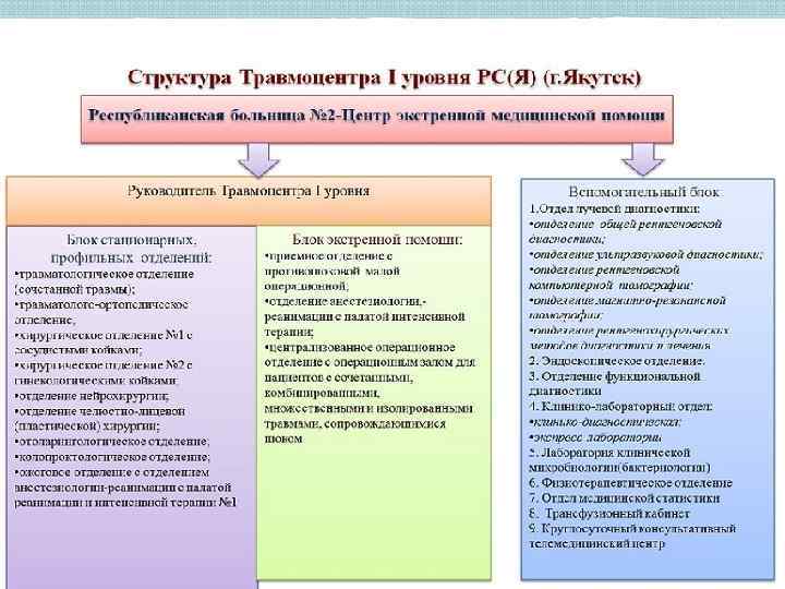 Травматизм и оказание травматологической помощи в Республике Саха (Якутия) В РС (Я) налажена система травматологической помощи и основополагающим моментом организации эффективного оказания медицинской помощи пострадавшим является четкость взаимодействия бригад скорой медицинской помощи, медицины катастроф и Травмоцентров 1, 2, 3 уровней: • своевременное оказание противошоковых мероприятий в полном объеме на этапах ответственности каждого звена; • четкое соблюдение зон ответственности травмоцентров и этапности оказания медицинской помощи пострадавшим при ДТП; • налаженная работа по эвакуации пострадавших, соблюдение правила «золотого часа» ; • неукоснительное соблюдение иерархической лестницы в сети травмоцентров по уровням, организация работы травмоцентра 1 уровня, как основного координирующего центра на всех этапах оказания медицинской помощи пострадавшим при ДТП.