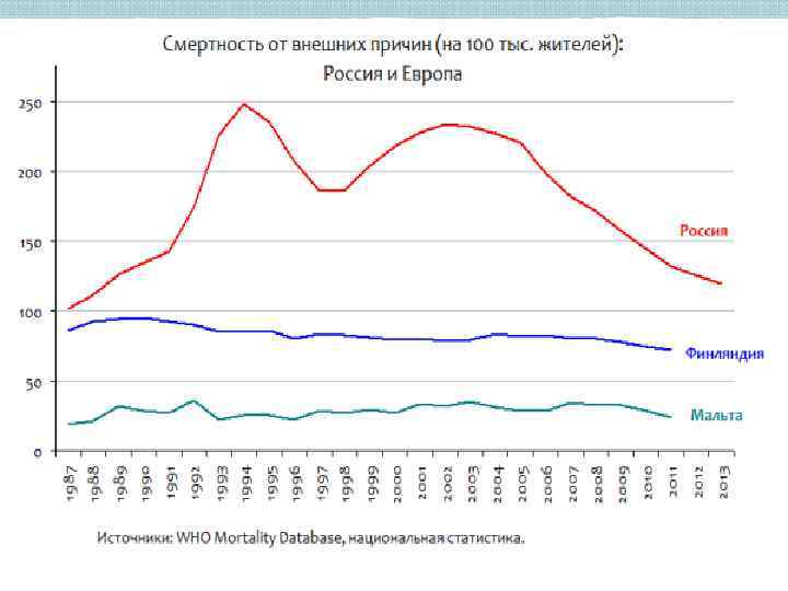 Уровни смертности от отдельных причин в России и других странах Европы (на 100 тыс. населения) Причина смерти Россия Страны европейского региона с наилучшими показателями Болезни системы кровообращения* 442, 7 55, 2 (Франция) Ишемическая болезнь сердца* 225, 6 20, 7 (Франция) Цереброваскулярные болезни* 120, 5 7, 9 (Швейцария) Рак лёгкого* 37, 1 16, 8 (Финляндия) Рак молочной железы* 28, 9 22, 5 (Швеция) Рак шейки матки* 8, 5 1, 0 (Мальта) Болезни органов дыхания** 70, 5 30, 9 (Австрия) Болезни органов пищеварения** 52, 7 15, 2 (Исландия) Транспортные несчастные 29, 1 случаи** * – возраст 25 64 года; ** – всё население 4, 3 (Мальта)