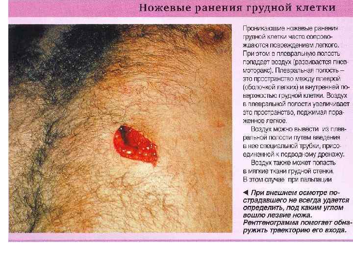 Открытый пневмоторакс Проникающие ранения грудной клетки с открытым пневмотораксом характеризуются тем, что воздух при вдохе всасывается через рану, а при выдохе выходит из неё наружу. Этот воздух вызывает спадение лёгкого и смещение органов средостения в здоровую сторону.