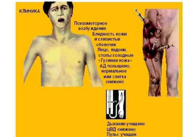 Отмечается спазм сосудов кожи — бледность, усиливающаяся по мере продолжения кровотечения и/или прогрессирования шока. Наблюдается: q. Тахикардия, Пульс сохраняет удовлетворительное наполнение, ритмичность; q Тахипноэ, q. Страх смерти, q. Холодный липкий пот, q Тремор (дрожание) или мелкие подёргивания мышц. q Зрачки расширены (реакция на боль), глаза блестят. q Взгляд беспокойный, ни на чём не останавливается.