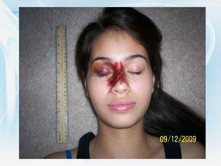 Травмы носа частые повреждения верхних дыхательных путей • Травмы носа являются самыми частыми повреждениями верхних дыхательных путей, и это обусловлено местоположением носа. • По характеру повреждения, которое зависит от силы, направления удара, а также травмирующего фактора, следует различать ушибы, переломы и ранения. • В случае травмы носового скелета наблюдаются трещины, переломы и/или вывихи костей и хрящей носа. • Отметим, что чаще всего переломам подвергаются носовые кости и перегородка, реже - лобные отростки верхней челюсти.