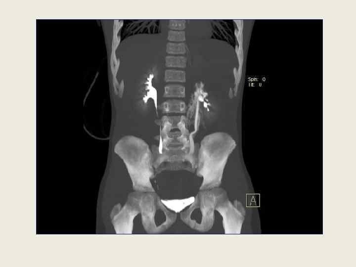 Ретроградная уретеропиелография Используется редко Ретроградная пиелограмма, травма нижнего полюса почки. Тени, исходящие из нижних чашечек, напоминают роговидный синусный рефлюкс. Деформация лоханки