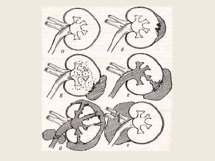 Открытые травмы 1) Ранение околопочечной клетчатки 2) Касательное ранение 3) Сквозное/слепое ранение без повреждения чашечнолоханочной с-мы 4) Сквозное/слепое ранение с повреждением чашечномисочной с-мы 5) Размозжение почки 6) Ранение больших сосудов почки
