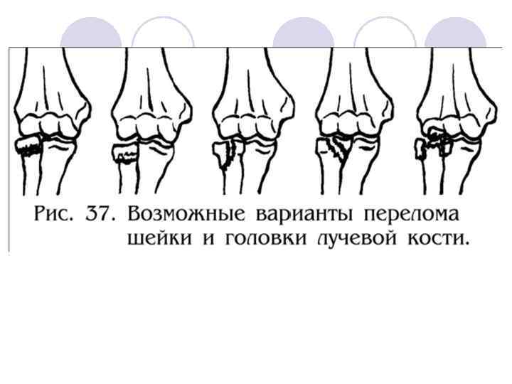 ПЕРЕЛОМ ГОЛОВКИ И ШЕЙКИ ЛУЧА Перелом головки и шейки луча наблюдается обычно при падении пострадавшего на выпрямленную руку. При переломе без смещения показана иммобилизация гипсом 2 3 недели, затем реабилитация 2 3 недели, трудоспособность восстанавливается через 1 1, 5 месяца. При переломе головки и шейки луча со смещением показано лечение в стационаре: репозиция (под наркозом), либо остеосинтез отломков спицами (обязательно проводить рентгеноконтроль через неделю после репозиции), последующая гипсовая иммобилизация проводится в течение 4 х недель, затем реабилитация занимает 2 4 недели.