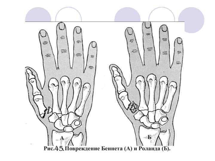 ПЕРЕЛОМ БЕННЕТТА Перелом Беннетта (внутрисуставной перелом основания 1 пястной кости с подвывихом ее тела) требует тщательной репозиции и гипсовой иммобилизации 5 6 недель, иногда до 6 8 недель. Часто возникают показания к металлоостеосинтезу фиксации отломков спицами или наружным аппаратом. Реабилитация занимает 2 4 недели. Трудоспособность восстанавливается через 1, 5 2 месяца. Неправильное лечение ведет к нарушению функционально важного сустава и функции 1 пальца, развитию деформирующего артроза и резкому снижению работоспособности кисти. Особенно снижается трудоспособность у лиц физического труда.