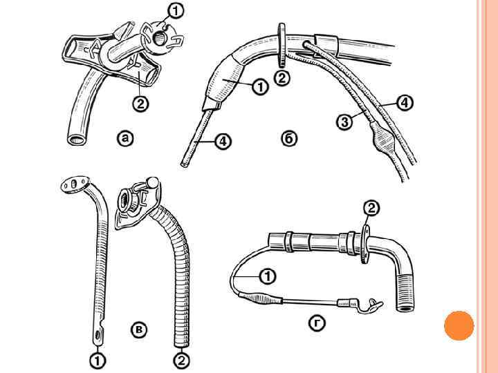 ОСНОВНЫЕ МОДЕЛИ ТРАХЕОСТОМИЧЕСКИХ КАНЮЛЬ: А — МЕТАЛЛИЧЕСКАЯ КАНЮЛЯ ЛЮЭРА (1 — ВНУТРЕННЯЯ ТРУБКА, 2 — ПОДВИЖНОЙ ЩИТОК); — КАУЧУКОВАЯ КАНЮЛЯ (1 — НАДУВНАЯ МАНЖЕТА, 2 — ОГРАНИЧИТЕЛЬ, 3 — ТРУБКА ДЛЯ НАДУВНОЙ МАНЖЕТЫ, 4 — ТРУБКА ДЛЯ ПРОВЕДЕНИЯ ЛЕЧЕБНЫХ МАНИПУЛЯЦИЙ); Б В — УДЛИНЕННЫЕ ГИБКИЕ МЕТАЛЛИЧЕСКИЕ КАНЮЛИ (1) И БРУНСА (2); КЕНИГА — ПЛАСТМАССОВАЯ КАНЮЛЯ С НАДУВНОЙ МАНЖЕТОЙ (1 — ТРУБКА ДЛЯ НАДУВАНИЯ МАНЖЕТЫ, 2 — ОГРАНИЧИТЕЛЬ). Г