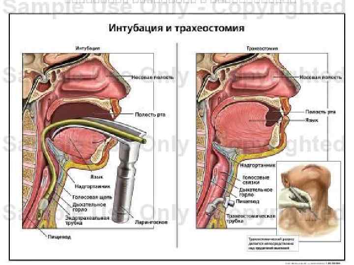 Показания: 1. Состоявшаяся или угрожающая непроходимость верхних дыхательных путей Острейшая (молниеносная). Развивается за секунды. Как правило, это — обтурация инородными телами Острая. Развивается за минуты. Инородные тела, истинный круп при дифтерии (обтурация пленками), отеки Квинке, реже — подсвязочный ларингит Подострая. Развивается за десятки минут, часы. Ложный круп, гортанная ангина, отёк при химических ожогах пищевода и пр. Хроническая. Развивается за сутки, месяцы, годы. Перихондрит, рубцовые сужения трахеи, рак гортани