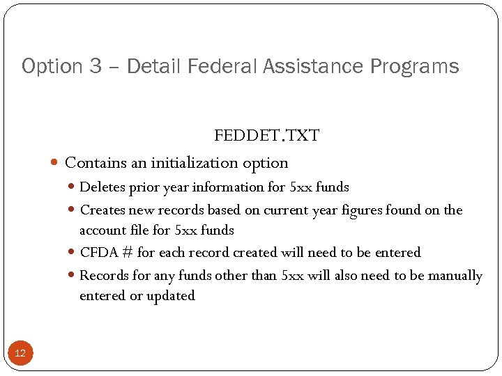 Option 3 – Detail Federal Assistance Programs FEDDET. TXT Contains an initialization option Deletes prior year information for 5 xx funds Creates new records based on current year figures found on the account file for 5 xx funds CFDA # for each record created will need to be entered Records for any funds other than 5 xx will also need to be manually entered or updated 12