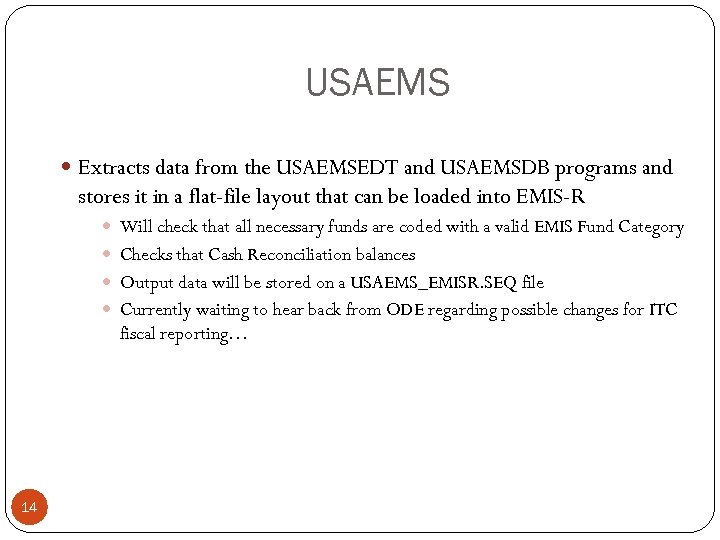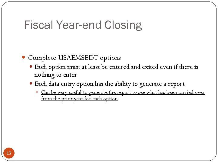 Fiscal Year-end Closing Complete USAEMSEDT options Each option must at least be entered and exited even if there is nothing to enter Each data entry option has the ability to generate a report Can be very useful to generate the report to see what has been carried over from the prior year for each option 13