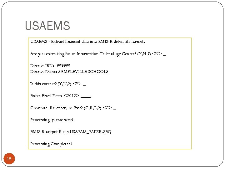 USAEMS - Extract financial data into EMIS-R detail file format. Are you extracting for an Information Technology Center? (Y, N, ? ) <N> _ District IRN: 999999 District Name: SAMPLEVILLE SCHOOLS Is this correct? (Y, N, ? ) <Y> _ Enter Fiscal Year: <2012> ____ Continue, Re-enter, or Exit? (C, R, E, ? ) <C> _ Processing, please wait! EMIS-R output file is USAEMS_EMISR. SEQ Processing Completed! 15