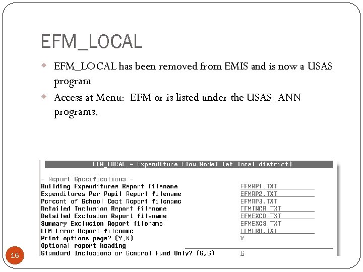 EFM_LOCAL w EFM_LOCAL has been removed from EMIS and is now a USAS program w Access at Menu: EFM or is listed under the USAS_ANN programs. 16