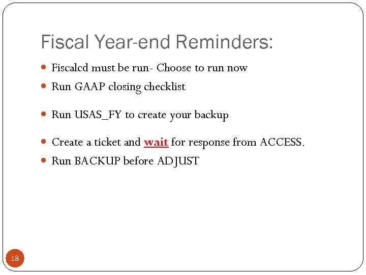 Fiscal Year-end Reminders: Fiscalcd must be run- Choose to run now Run GAAP closing checklist Run USAS_FY to create your backup Create a ticket and wait for response from ACCESS. Run BACKUP before ADJUST 18