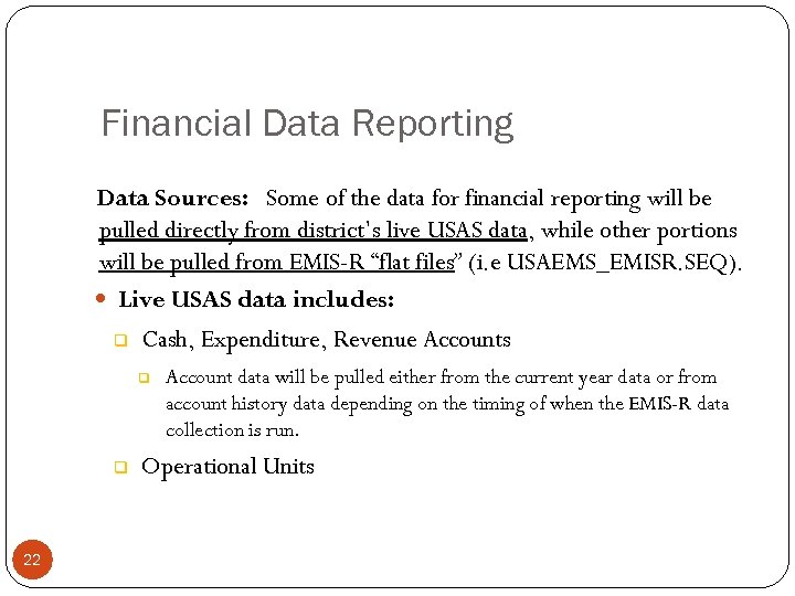 Financial Data Reporting Data Sources: Some of the data for financial reporting will be pulled directly from district’s live USAS data, while other portions will be pulled from EMIS-R “flat files” (i. e USAEMS_EMISR. SEQ). Live USAS data includes: q Cash, Expenditure, Revenue Accounts q q 22 Account data will be pulled either from the current year data or from account history data depending on the timing of when the EMIS-R data collection is run. Operational Units