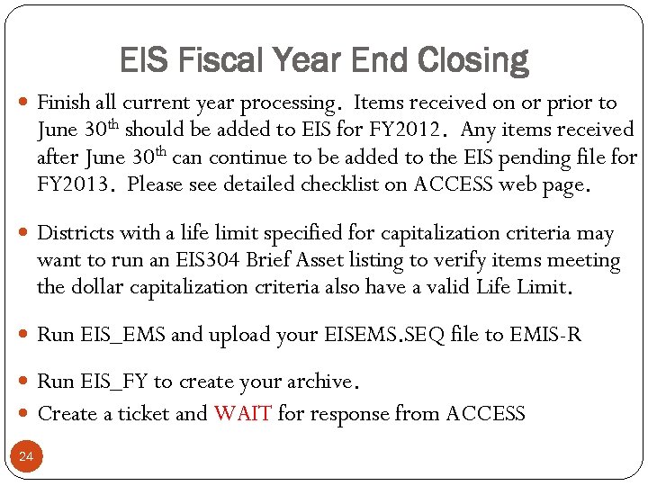 EIS Fiscal Year End Closing Finish all current year processing. Items received on or prior to June 30 th should be added to EIS for FY 2012. Any items received after June 30 th can continue to be added to the EIS pending file for FY 2013. Please see detailed checklist on ACCESS web page. Districts with a life limit specified for capitalization criteria may want to run an EIS 304 Brief Asset listing to verify items meeting the dollar capitalization criteria also have a valid Life Limit. Run EIS_EMS and upload your EISEMS. SEQ file to EMIS-R Run EIS_FY to create your archive. Create a ticket and WAIT for response from ACCESS 24