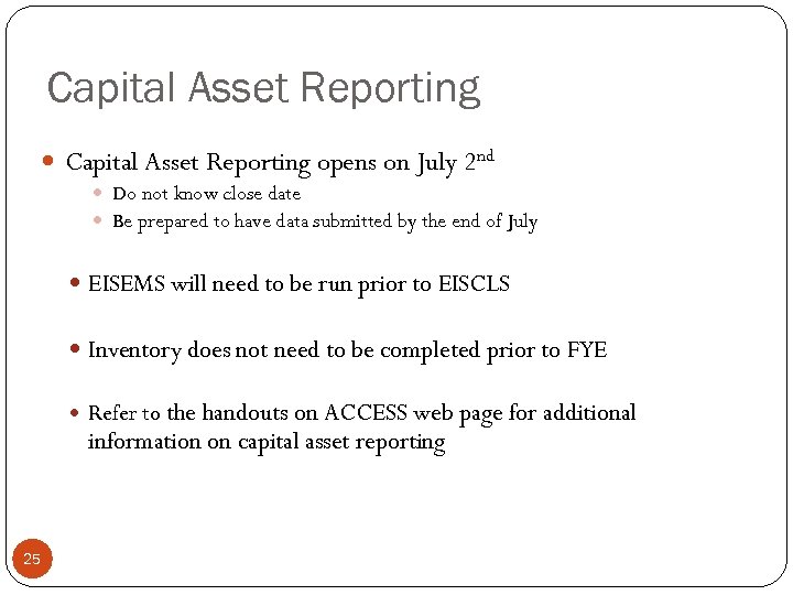 Capital Asset Reporting opens on July 2 nd Do not know close date Be prepared to have data submitted by the end of July EISEMS will need to be run prior to EISCLS Inventory does not need to be completed prior to FYE Refer to the handouts on ACCESS web page for additional information on capital asset reporting 25