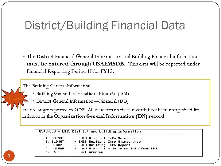 District/Building Financial Data • The District Financial General Information and Building Financial information must be entered through USAEMSDB. This data will be reported under Financial Reporting Period H for FY 12. The Building General Information • Building General Information– Financial (DM) Note: • District General Information—Financial (DD) are no longer reported to ODE. All elements on these records have been reorganized for inclusion in the Organization General Information (DN) record 3