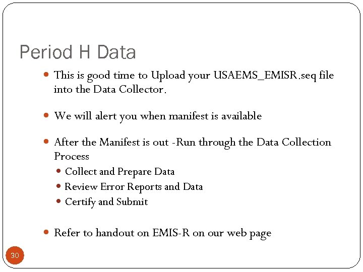 Period H Data This is good time to Upload your USAEMS_EMISR. seq file into the Data Collector. We will alert you when manifest is available After the Manifest is out -Run through the Data Collection Process Collect and Prepare Data Review Error Reports and Data Certify and Submit Refer to handout on EMIS-R on our web page 30