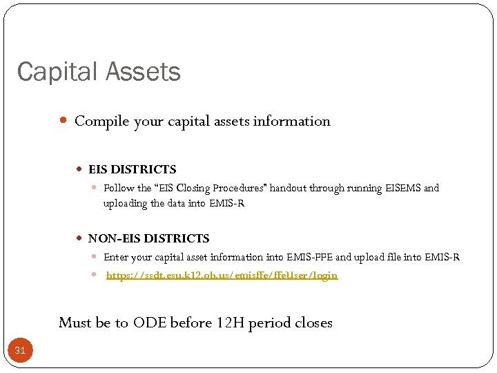 Capital Assets Compile your capital assets information EIS DISTRICTS Follow the “EIS Closing Procedures” handout through running EISEMS and uploading the data into EMIS-R NON-EIS DISTRICTS Enter your capital asset information into EMIS-FFE and upload file into EMIS-R https: //ssdt. esu. k 12. oh. us/emisffe/ffe. User/login Must be to ODE before 12 H period closes 31