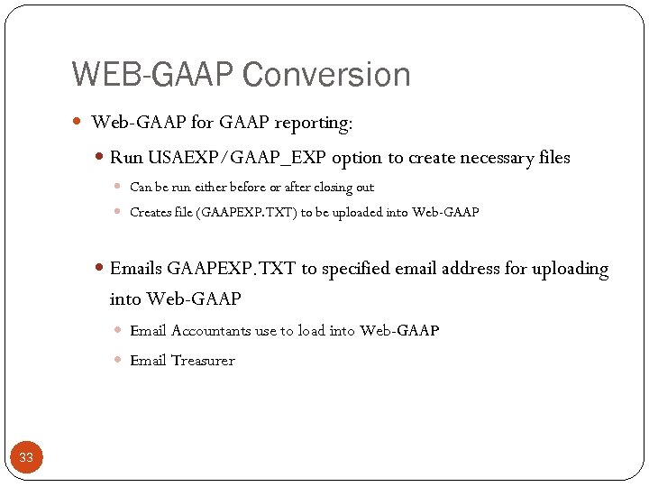 WEB-GAAP Conversion Web-GAAP for GAAP reporting: Run USAEXP/GAAP_EXP option to create necessary files Can be run either before or after closing out Creates file (GAAPEXP. TXT) to be uploaded into Web-GAAP Emails GAAPEXP. TXT to specified email address for uploading into Web-GAAP Email Accountants use to load into Web-GAAP Email Treasurer 33