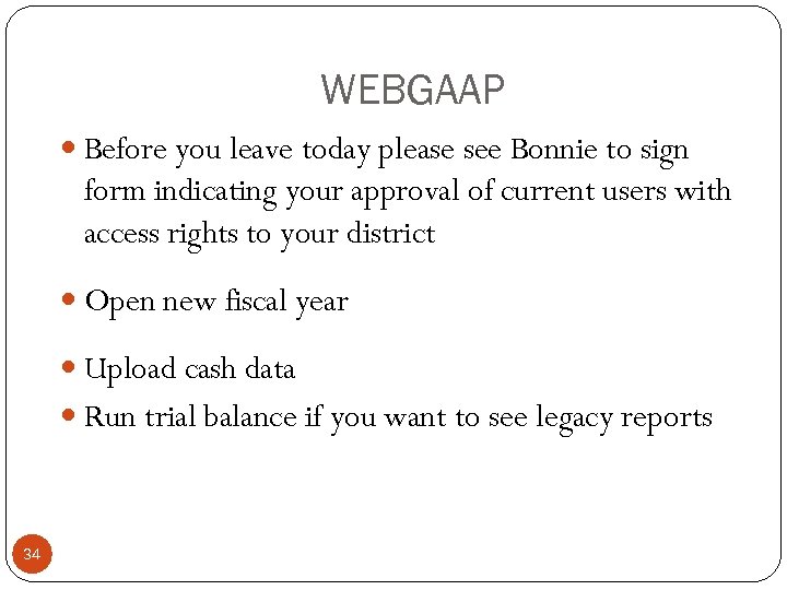WEBGAAP Before you leave today please see Bonnie to sign form indicating your approval of current users with access rights to your district Open new fiscal year Upload cash data Run trial balance if you want to see legacy reports 34