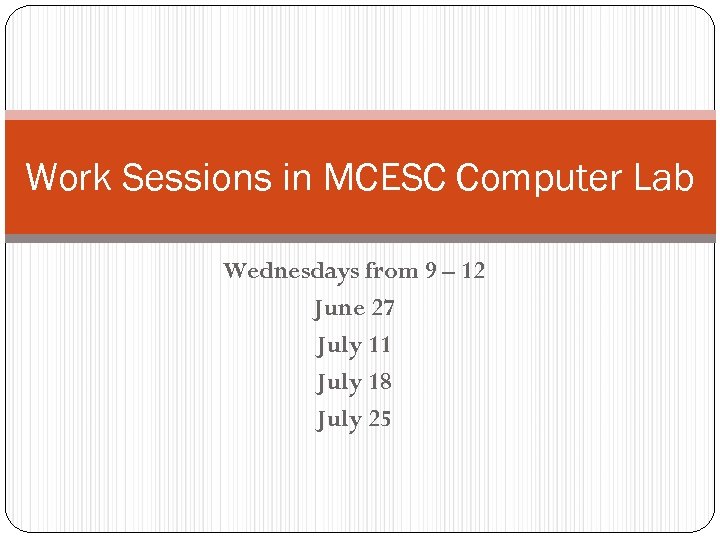 Work Sessions in MCESC Computer Lab Wednesdays from 9 – 12 June 27 July 11 July 18 July 25