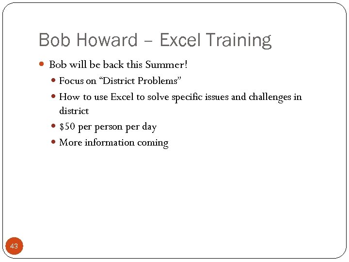Bob Howard – Excel Training Bob will be back this Summer! Focus on “District Problems” How to use Excel to solve specific issues and challenges in district $50 person per day More information coming 43
