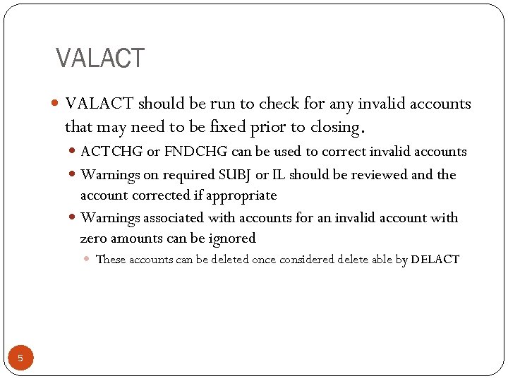 VALACT should be run to check for any invalid accounts that may need to be fixed prior to closing. ACTCHG or FNDCHG can be used to correct invalid accounts Warnings on required SUBJ or IL should be reviewed and the account corrected if appropriate Warnings associated with accounts for an invalid account with zero amounts can be ignored These accounts can be deleted once considered delete able by DELACT 5