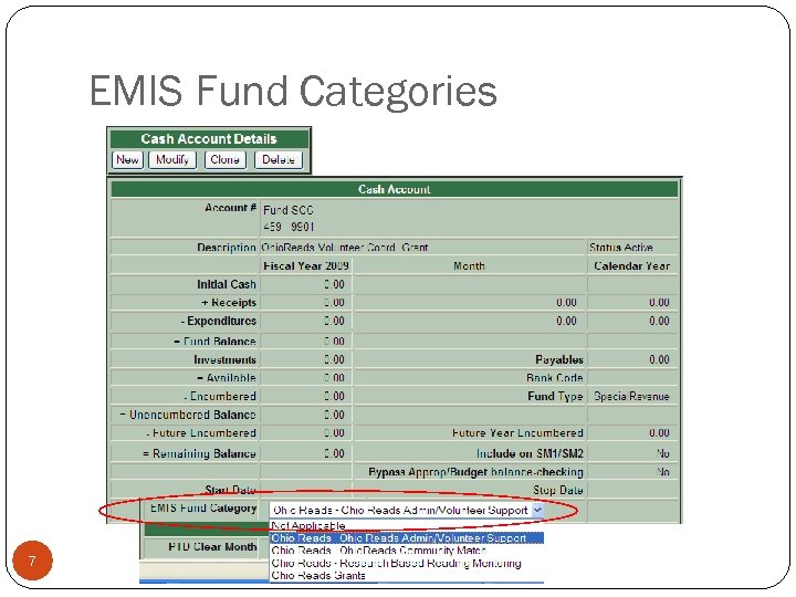 EMIS Fund Categories VALACT Lists errors for invalid fund categories Lists warnings for funds that should have an EMIS category but don’t EMISFCAT report Lists all funds and associated fund category Enter * if no appropriate code exists 6
