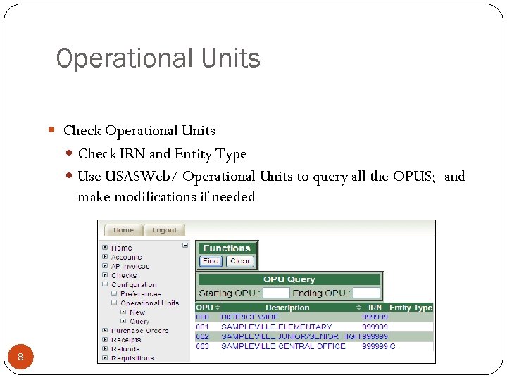 Operational Units Check IRN and Entity Type Use USASWeb/ Operational Units to query all the OPUS; and make modifications if needed 8