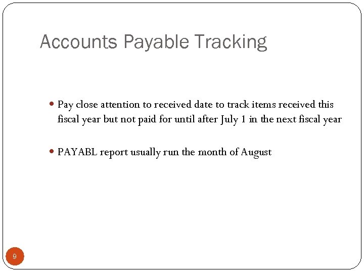 Accounts Payable Tracking Pay close attention to received date to track items received this fiscal year but not paid for until after July 1 in the next fiscal year PAYABL report usually run the month of August 9