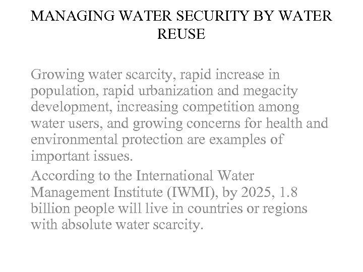 MANAGING WATER SECURITY BY WATER REUSE Growing water scarcity, rapid increase in population, rapid urbanization and megacity development, increasing competition among water users, and growing concerns for health and environmental protection are examples of important issues. According to the International Water Management Institute (IWMI), by 2025, 1. 8 billion people will live in countries or regions with absolute water scarcity.