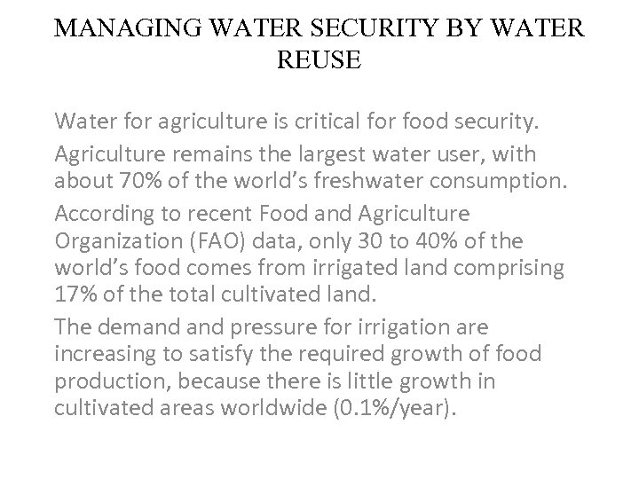 MANAGING WATER SECURITY BY WATER REUSE Water for agriculture is critical for food security. Agriculture remains the largest water user, with about 70% of the world’s freshwater consumption. According to recent Food and Agriculture Organization (FAO) data, only 30 to 40% of the world’s food comes from irrigated land comprising 17% of the total cultivated land. The demand pressure for irrigation are increasing to satisfy the required growth of food production, because there is little growth in cultivated areas worldwide (0. 1%/year).