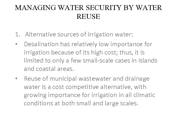 MANAGING WATER SECURITY BY WATER REUSE 1. Alternative sources of irrigation water: • Desalination has relatively low importance for irrigation because of its high cost; thus, it is limited to only a few small-scale cases in islands and coastal areas. • Reuse of municipal wastewater and drainage water is a cost competitive alternative, with growing importance for irrigation in all climatic conditions at both small and large scales.