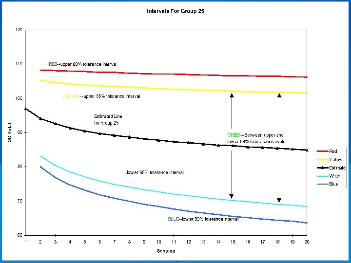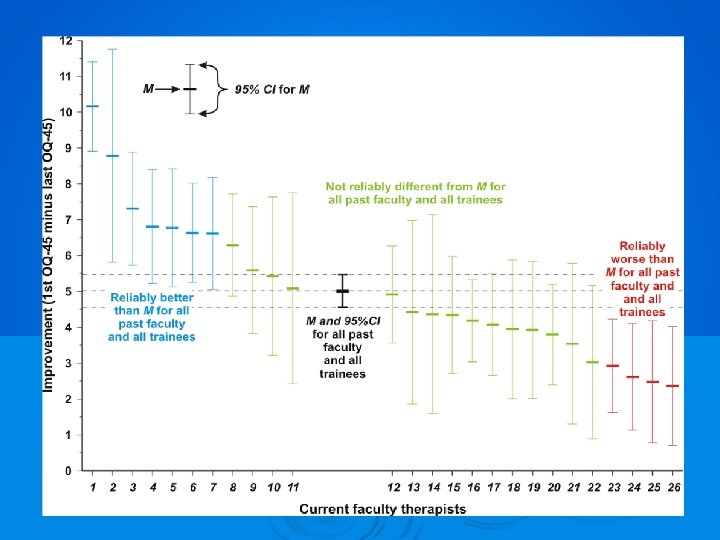 Ø On average, every therapist’s clients improved. Ø The average of improvement scores for all past professionals and all trainees is depicted in black. Ø Average improvement scores for 7 therapists (in blue), are significantly better than this overall average.