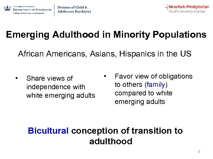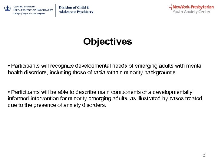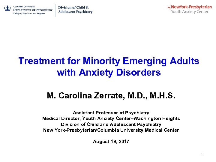 Treatment for Minority Emerging Adults with Anxiety Disorders M. Carolina Zerrate, M. D. , M. H. S. Assistant Professor of Psychiatry Medical Director, Youth Anxiety Center–Washington Heights Division of Child and Adolescent Psychiatry New York-Presbyterian/Columbia University Medical Center August 19, 2017 1